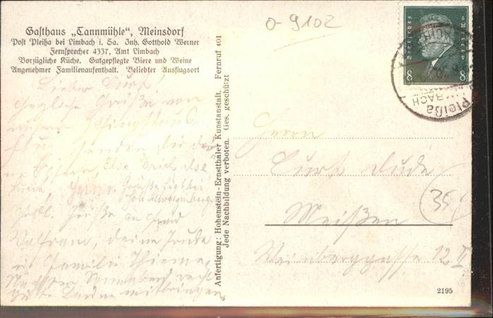 40907036 Limbach-Oberfrohna Sachsen Meinsdorf Gasthaus Tannmuehle postalisch gelaufen Alte Ansichtskarte Postkarte alte Postkarte Katcode 11110014173140