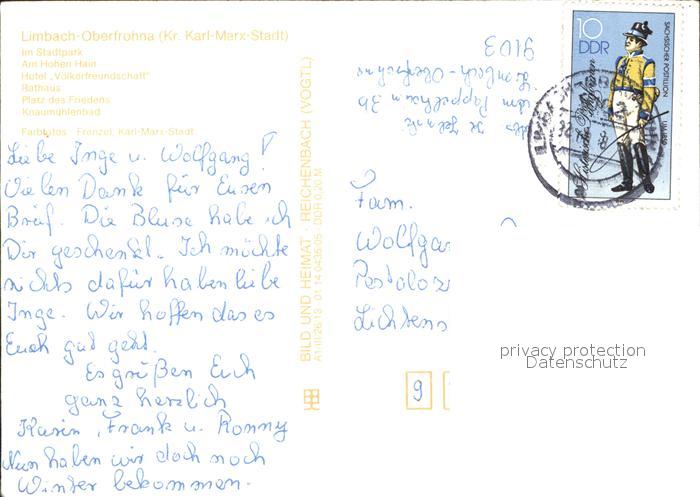 72322730 alte Postkarte Limbach Oberfrohna Stadtpark Am Hohen Hain Hotel Voelkerfreundschaft Rathaus PdF Knaumuehlenbad postalisch gelaufen Erhaltung siehe scans KatCode: 11110014173140