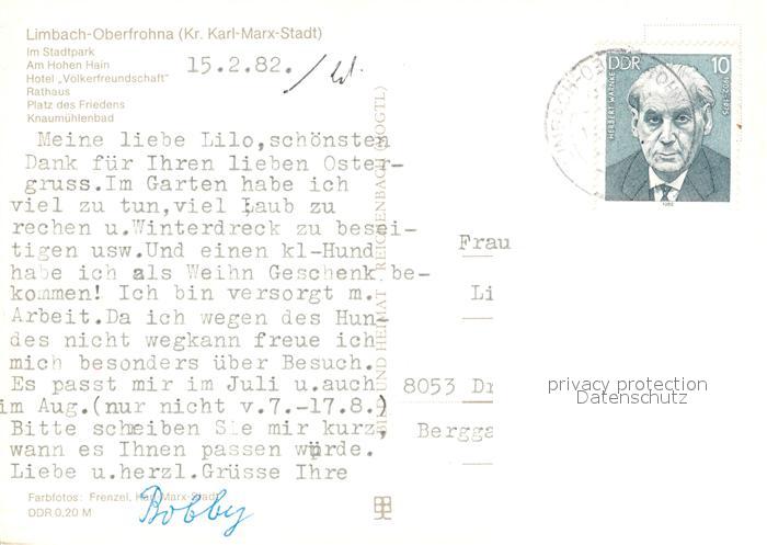 73606943 alte Postkarte Limbach Oberfrohna Stadtpark Am Hohen Hain Hotel Voelkerfreundschaft Rathaus Platz des Friedens Knaumuehlenbad postalisch gelaufen Erhaltung siehe scans [WerneD78] KatCode: 11110014173140