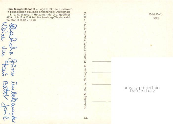 73662570 Limbach Westerwald Gaestehaus Pension Haus Margarethenhof am Hochwald Restaurant postalisch nicht gelaufen Erhaltung siehe scans [FriedD77] KatCode: 11110007143257