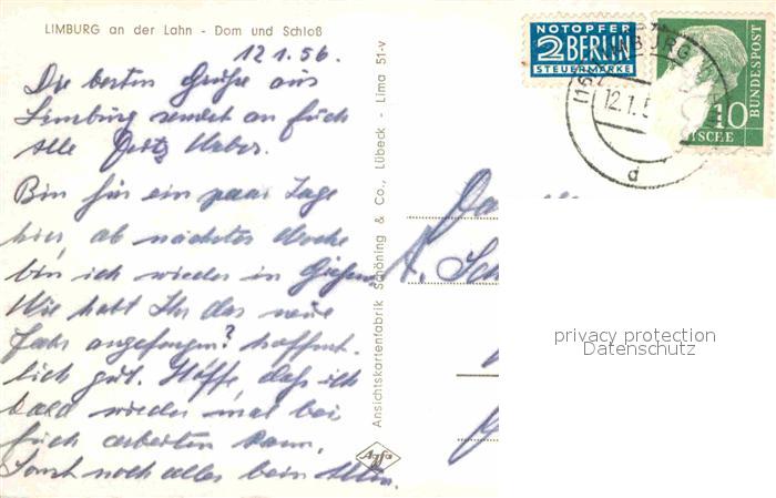 72854893 alte Postkarte Limburg Lahn Dom und Schloss postalisch gelaufen Erhaltung siehe scans [WerneD78] KatCode: 11110006533009
