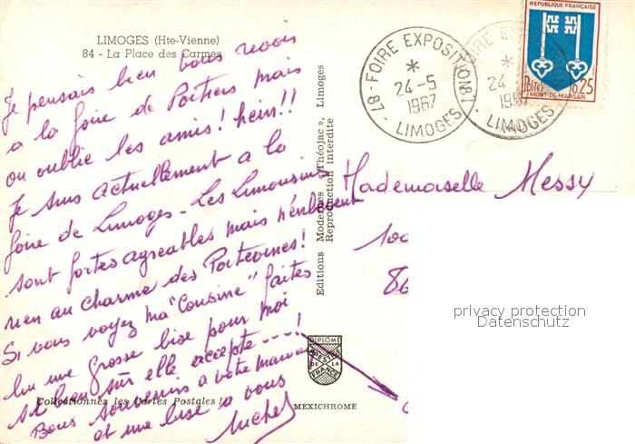 13585643 Limoges Haute Vienne La Place des Carmes postalisch gelaufen Erhaltung siehe scans [KathaD81] carte postale Kath Katcode 11170087287085