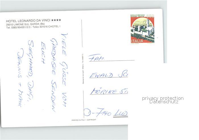 old postcard Limone sul Garda Hotel Leonardo da Vinci Fliegeraufnahme postalisch gelaufen Erhaltung siehe scans