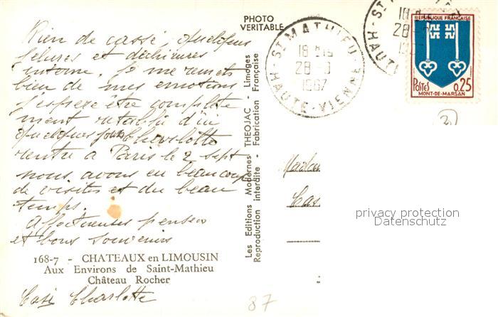 13485879 carte postale Limousin Region Aux Environs de Saint Mathieu Chateau Rocher postalisch gelaufen Erhaltung siehe scans [WerneD78] KatCode: 11170087287085