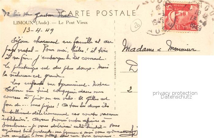 13489575 carte postale Limoux Le Pont Vieux postalisch gelaufen Erhaltung siehe scans [WerneD78] KatCode: 11170011211206