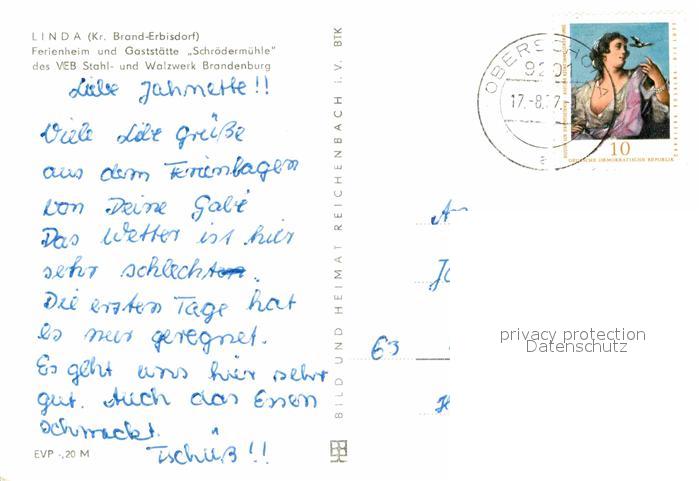 72635963 alte Postkarte Linda Brand-Erbisdorf Ferienheim Gaststaette Schroedermuehle VEB Stahl und Walzwerk Brandenburg postalisch gelaufen Erhaltung siehe scans [FriedD77] KatCode: 11110014177030