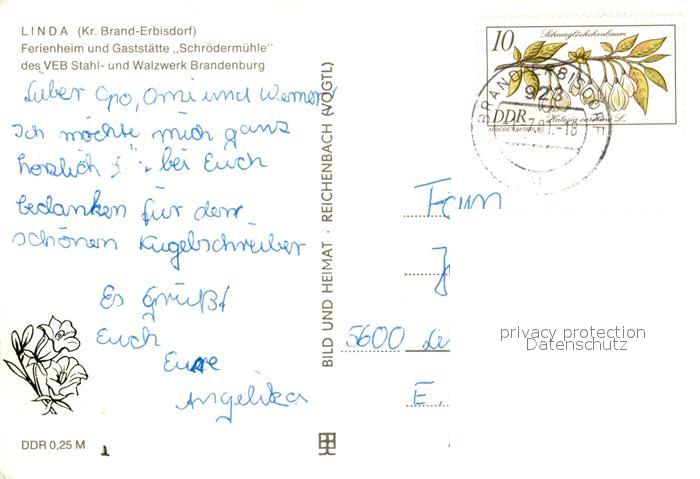 73093199 alte Postkarte Linda Brand-Erbisdorf Ferienheim Restaurant Schroedermuehle VEB Stahl- und Walzwerk Brandenburg postalisch gelaufen Erhaltung siehe scans [LiesaD40] KatCode: 11110014177030