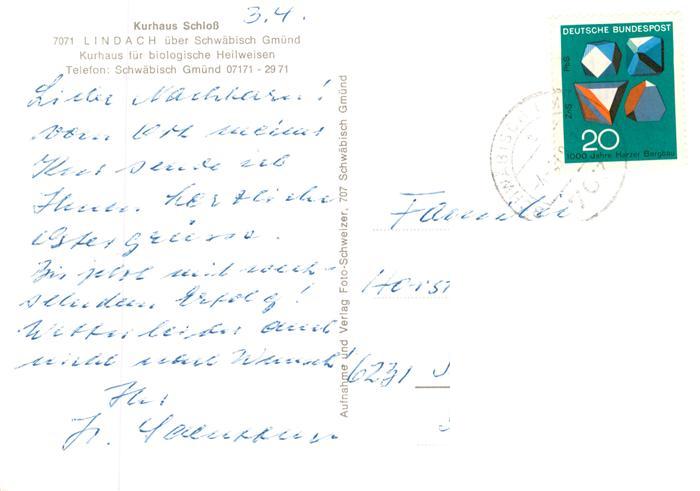 73888883 alte Postkarte Lindach Schwaebisch Gmuend Kurhaus Schloss postalisch gelaufen Erhaltung siehe scans [FriedD77] KatCode: 11110008136065