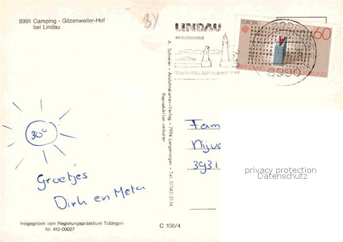 72865474 alte Postkarte Lindau Bodensee Camping Gitzenweiler Hof See Freibad Alpenkette Fliegeraufnahme postalisch gelaufen Erhaltung siehe scans [FriedD77] KatCode: 11110009776116