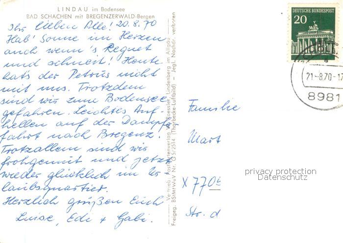 73656609 alte Postkarte Lindau Bodensee Fliegeraufnahme mit Bad Schachen und Bregenzerwald postalisch gelaufen Erhaltung siehe scans [WerneD78] KatCode: 11110009776116