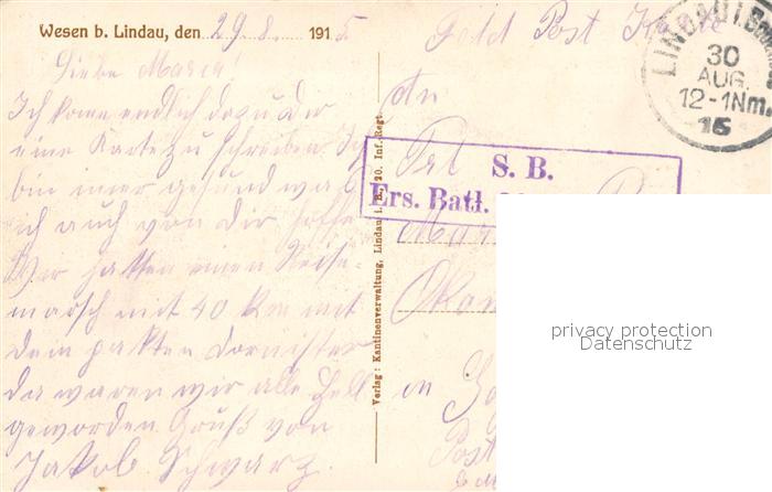 32977226 alte Postkarte Lindau Bodensee Wesen 20. Inf.-Regt 2. Ersantzbataillon Rekrutendepot postalisch gelaufen Feldpost Erhaltung siehe scans [NatalD47] KatCode: 11110009776116