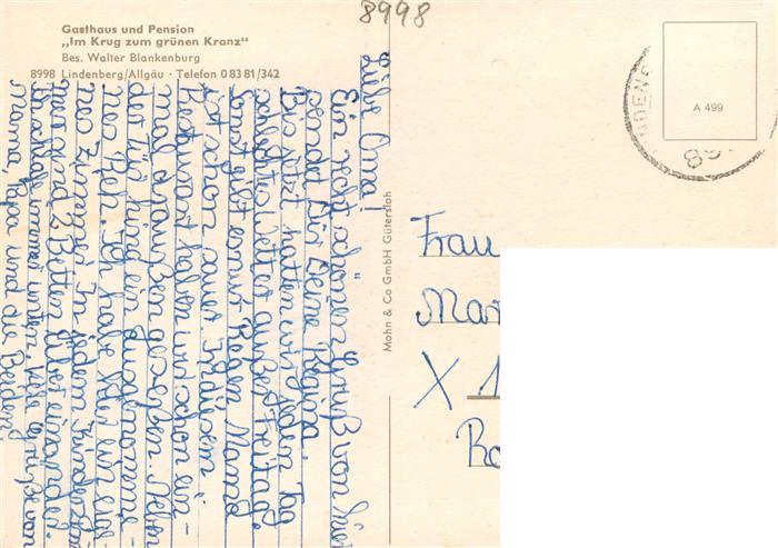 73872092 alte Postkarte Lindenberg Allgaeu Gasthaus Pension Im Krug zum gruenen Kranz postalisch gelaufen Erhaltung siehe scans [FriedD77] KatCode: 11110009776117