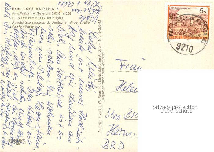 73739746 alte Postkarte Lindenberg Allgaeu Hotel Cafe Alpina Panorama postalisch gelaufen Erhaltung siehe scans [WerneD78] KatCode: 11110009776117
