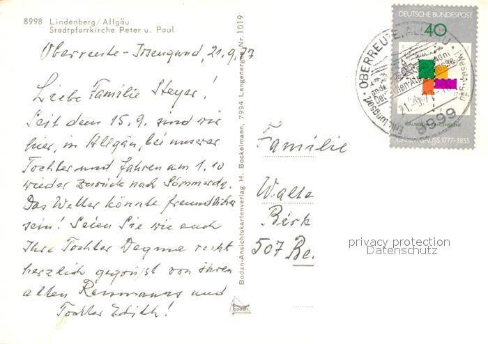 73015433 alte Postkarte Lindenberg Allgaeu Stadtpfarrkirche Peter und Paul postalisch gelaufen Erhaltung siehe scans [WerneD78] KatCode: 11110009776117