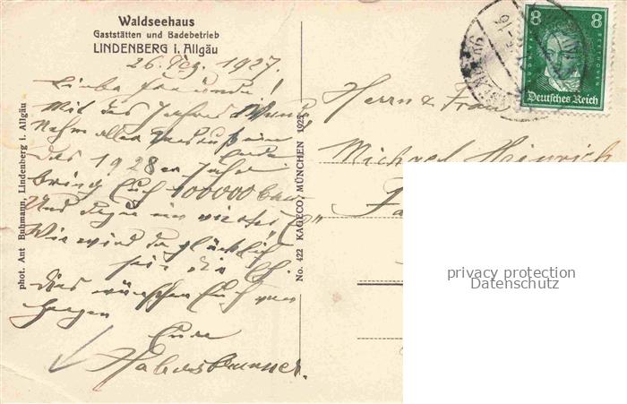 34142727 alte Postkarte Lindenberg Allgaeu Waldseehaus Gaststaetten postalisch gelaufen Erhaltung siehe scans [WerneD78] KatCode: 11110009776117