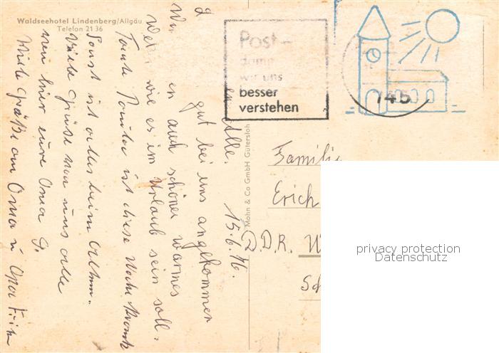 73845542 alte Postkarte Lindenberg Allgaeu Waldseehotel Lindenberg postalisch gelaufen Erhaltung siehe scans [WerneD78] KatCode: 11110009776117