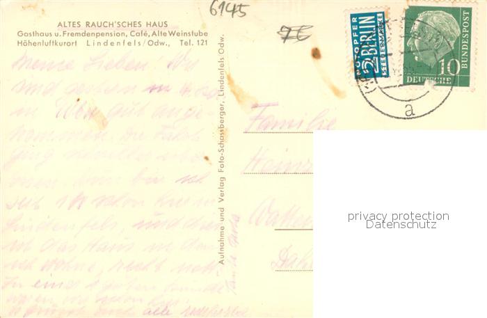 73755158 alte Postkarte Lindenfels Odenwald Altes Rauchsches Haus Gasthaus postalisch gelaufen Erhaltung siehe scans [LiesaD40] KatCode: 11110006431015