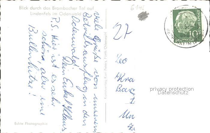 72098442 alte Postkarte Lindenfels Odenwald Blick durch das Brombacher Tal postalisch gelaufen KatCode: 11110006431015