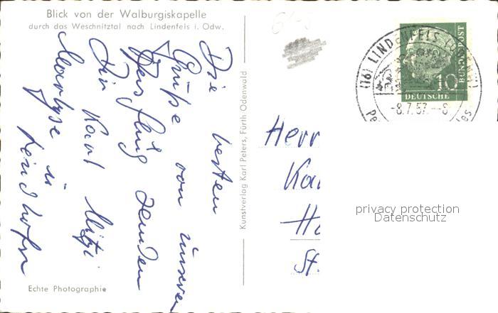 72098501 alte Postkarte Lindenfels Odenwald Blick von der Walburgiskapelle postalisch gelaufen KatCode: 11110006431015