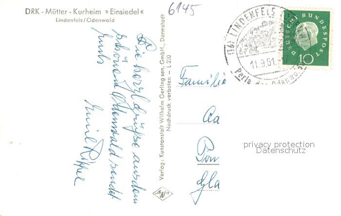 73755159 alte Postkarte Lindenfels Odenwald DRK-Muetter-Kurheim Einsiedel Aussenansicht postalisch gelaufen Erhaltung siehe scans [LiesaD40] KatCode: 11110006431015