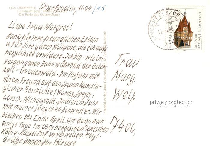 73208099 alte Postkarte Lindenfels Odenwald Fliegeraufnahme postalisch gelaufen Erhaltung siehe scans [WerneD78] KatCode: 11110006431015