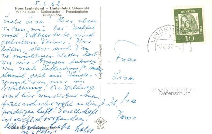 43350517 alte Postkarte Lindenfels Odenwald Fremdenheim Weinklause Haus Luginsland Terrasse Fernsicht postalisch gelaufen Erhaltung siehe scans [FriedD77] KatCode: 11110006431015