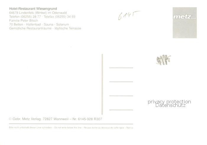 73762755 Lindenfels Odenwald Hotel Restaurant Wiesengrund postalisch nicht gelaufen Erhaltung siehe scans [FriedD77] KatCode: 11110006431015