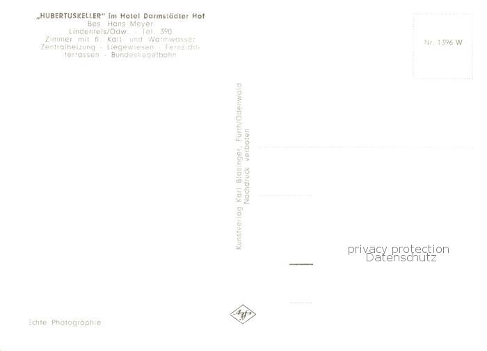 73852762 Lindenfels Odenwald Hubertuskaller im Hotel Darmstaedter Hof postalisch nicht gelaufen Erhaltung siehe scans [WerneD78] KatCode: 11110006431015