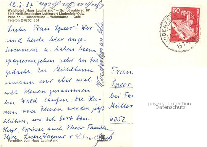 73268608 alte Postkarte Lindenfels Odenwald Waldhotel Haus Luginsland postalisch gelaufen Erhaltung siehe scans [PaolaD17] KatCode: 11110006431015