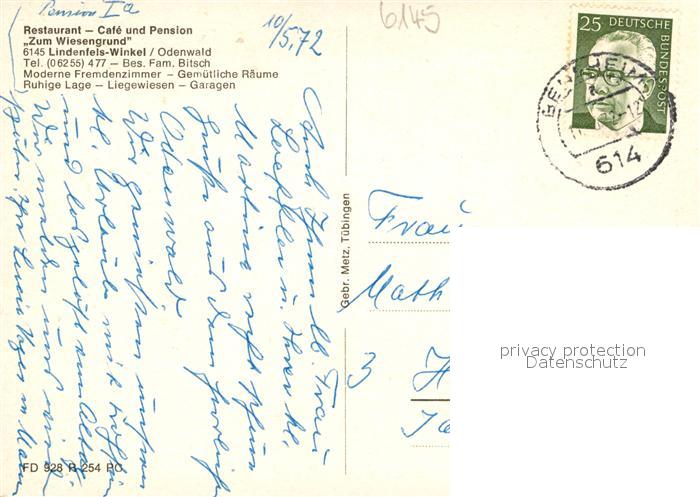 73031413 alte Postkarte Lindenfels Odenwald Winkel Restaurant Cafe Pension Zum Wiesengrund postalisch gelaufen Erhaltung siehe scans [KathaD81] KatCode: 11110006431015