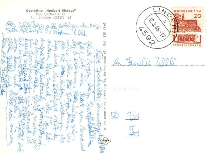 73876788 alte Postkarte Lindern Oldenburg Gaststaette Heribert Einhaus Gastraeume Bar postalisch gelaufen Erhaltung siehe scans [FriedD77] KatCode: 11110003453010
