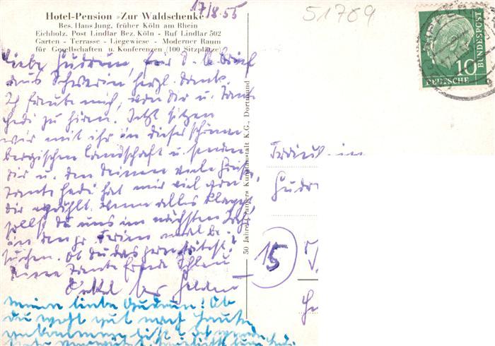 73869173 alte Postkarte Lindlar Hotel Pension Zur Waldschenke Eichholz Gesellschaftszimmer Suelztal mit Forellenzuchtanlagen Ortsansicht postalisch gelaufen Erhaltung siehe scans [FriedD77] KatCode: 11110005374020