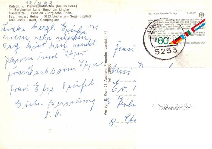 72630605 alte Postkarte Lindlar Kutsch- und Planwagenfahrten Irmgard Heinen postalisch gelaufen Erhaltung siehe scans [LiesaD40] KatCode: 11110005374020