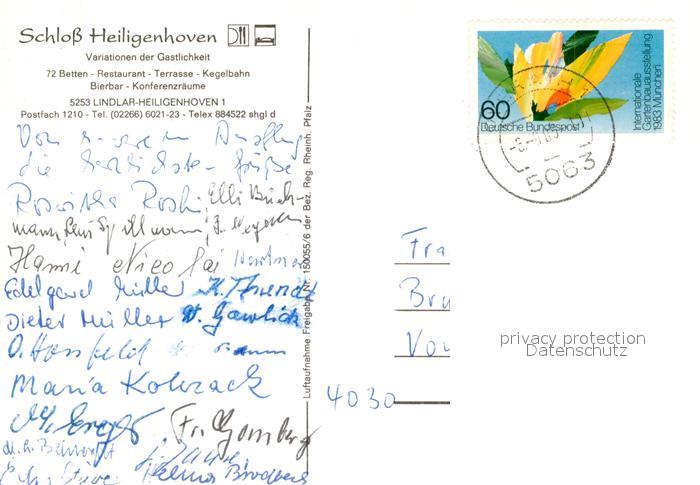 73323039 alte Postkarte Lindlar Schloss Heiligenhoven Hotel Restaurant Fliegeraufnahme postalisch gelaufen Erhaltung siehe scans [FriedD77] KatCode: 11110005374020