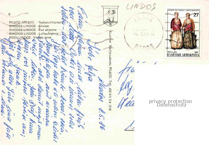 74110222 old postcard Lindos Lindo Rhodes Greece Fliegeraufnahme postalisch gelaufen Erhaltung siehe scans [WerneD78] KatCode: 11190