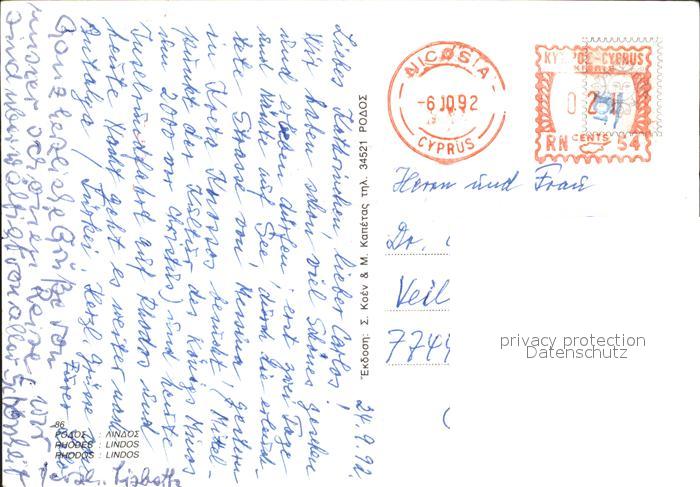 old postcard Lindos Lindo Schiff Strand postalisch gelaufen Erhaltung siehe scans