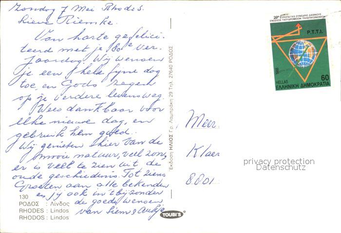 old postcard Lindos Lindo Strand Boote Ruine postalisch gelaufen Erhaltung siehe scans