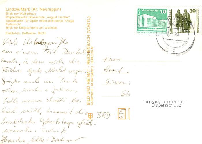 73152454 alte Postkarte Lindow Mark Kulturhaus Polytechnische Oberschule Gedenkstein Teilansicht Klostermuehle Wutzsee postalisch gelaufen Erhaltung siehe scans [FriedD77] KatCode: 11110012068280