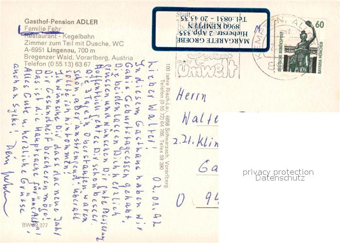 73515909 alte Postkarte Lingenau Vorarlberg Gasthof Pension Adler Restaurant Kegelbahn Alpenpanorama Wappen postalisch gelaufen Erhaltung siehe scans [FriedD77] KatCode: 11390341080225