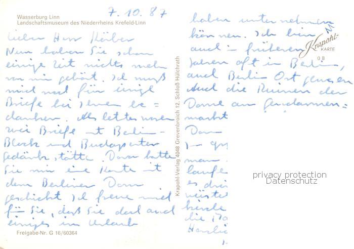 73796579 alte Postkarte Linn Krefeld Wasserburg Linn Landschaftsmuseum des Niederrheins Krefeld Linn postalisch gelaufen Erhaltung siehe scans [WerneD78] KatCode: 11110005114000