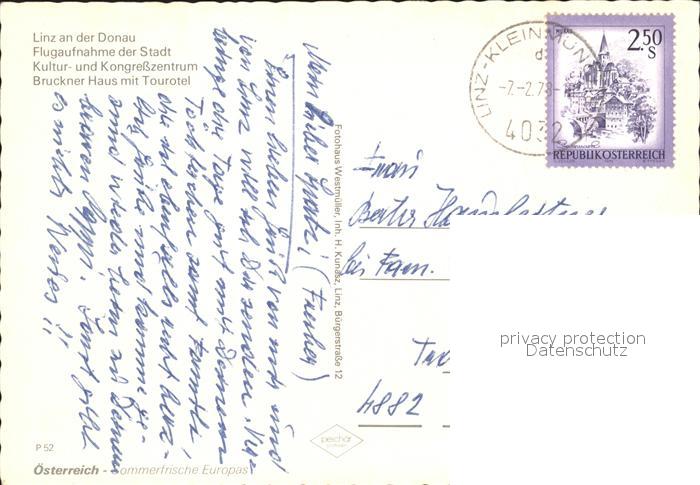 72263192 alte Postkarte Linz Donau Kultur und Kongresszentrum Bruckner Haus Tourotel Fliegeraufnahme postalisch gelaufen Erhaltung siehe scans KatCode: 11390312040101