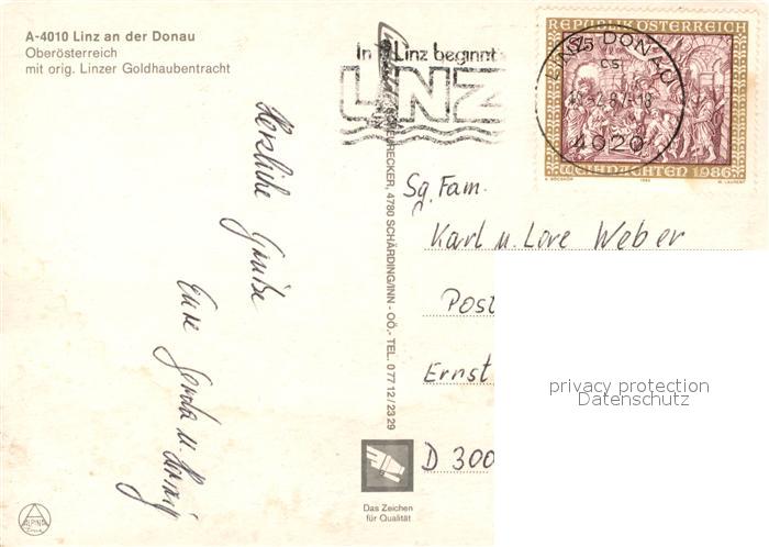 73313805 alte Postkarte Linz Donau Panorama Blick ueber die Donau Original Linzer Goldhaubentracht postalisch gelaufen Erhaltung siehe scans [FriedD77] KatCode: 11390312040101