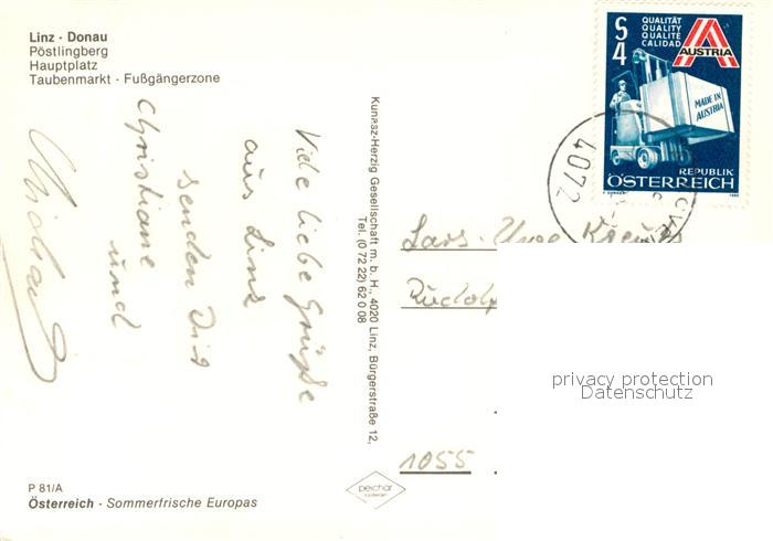 72926295 alte Postkarte Linz Donau Poestlingberg Basilika Hauptplatz Pestsaeule Taubenmarkt Fussgaengerzone Brunnen postalisch gelaufen Erhaltung siehe scans [FriedD77] KatCode: 11390312040101