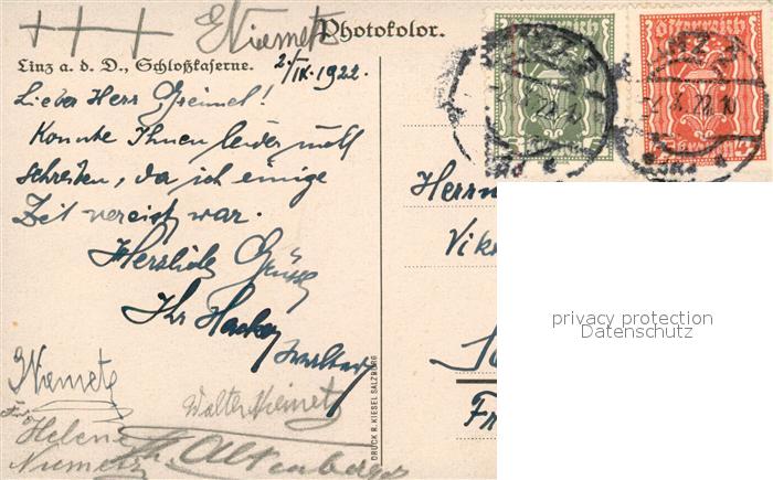 43105874 alte Postkarte Linz Donau Schlosskaserne postalisch gelaufen Erhaltung siehe scans [FriedD77] KatCode: 11390312040101