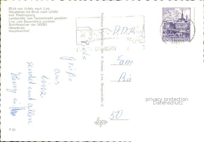 72207554 alte Postkarte Linz Donau Totalansicht Hauptplatz mit Urfahr und Poestlingberg Landstrasse Bauernberg Schiffstation an der DDSG Hauptbahnhof postalisch gelaufen Erhaltung siehe scans KatCode: 11390312040101