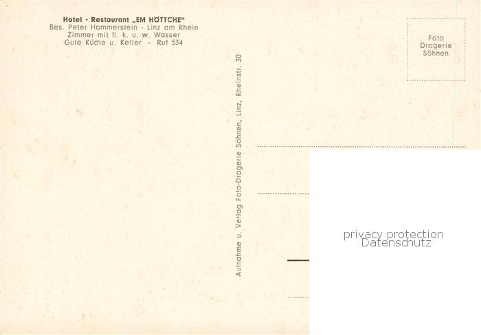 73844880 Linz Rhein Hotel Restaurant Em Hoettche postalisch nicht gelaufen Erhaltung siehe scans [FriedD77] KatCode: 11110007138041