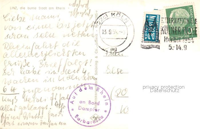 73807503 alte Postkarte Linz Rhein Panorama Fahrgastschiff Barbarossa postalisch gelaufen Erhaltung siehe scans [WerneD78] KatCode: 11110007138041