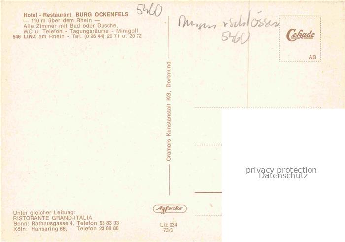 74050255 Linz Rhein Rheinland-Pfalz Burg Ockenfels Minigolf Terrasse Gastraum Rheinpartie postalisch nicht gelaufen Erhaltung siehe scans [WerneD78] KatCode: 11110007138041