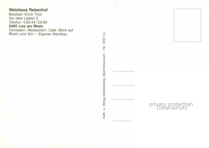 72668825 Linz Rhein Weinhaus Rebenhof postalisch nicht gelaufen Erhaltung siehe scans [LiesaD40] KatCode: 11110007138041