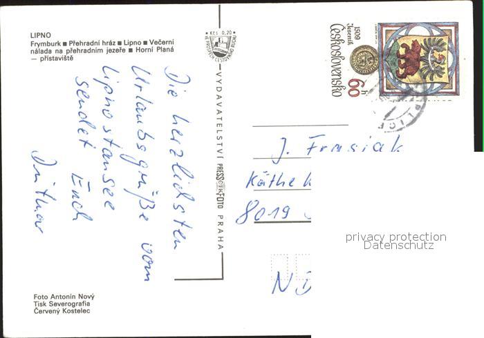 old postcard Lipno Frymburk Pfehradni hraz Lipno Vecerni nalada postalisch gelaufen Erhaltung siehe scans